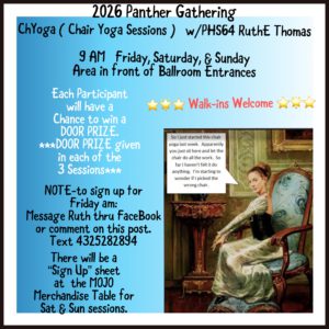 9am | BALLROOM ENTRANCE AREA *Ruth Thomas | Chair Yoga *Door Prize ~message Ruth thru FaceBook or text Vickie 4325282894~ Walk-ins Welcome | |